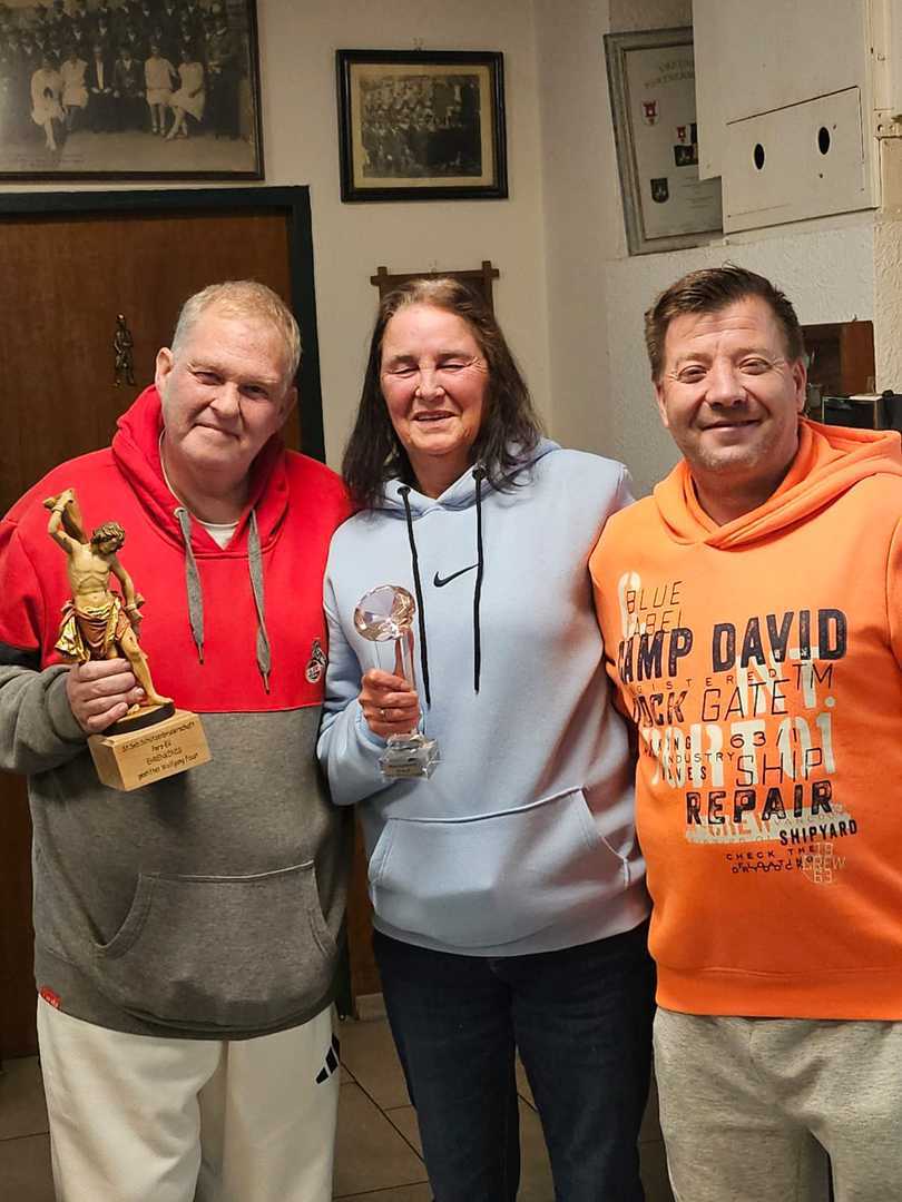 Am 22.11.2025 wurde, wie in jedem Jahr, der neue Ehrenkönig/in der Sankt Sebastianus Schützenbruderschaft Porz Eil ausgeschossen. Geschossen wurde bei beiden Anwärtern auf einen Gipsvogel. Pünktlich um 19 Uhr starteten Männer und Frauen jeweils auf ihren dafür vorgesehenen Gipsvogel das Schießen. Nach kurzer Warm-up-Phase fiel bei den Frauen der erste Flügel, den sich unsere Königin Ramona Fösgen sicherte. Auch der 2. Flügel bei den Frauen fiel dann schnell nach und wurde von Sabrina Feuser gesichert. Die Männer schossen zeitgleich, aber dieser Vogel entpuppte sich als harte Nuss. Verbissen kämpften die Frauen um das noch anliegende Schwänzchen des Vogels, das gab aber dann auch nach und wurde von Silke Fösgen gesichert. Bei den Frauen ging es dann auf den Rumpf und das Erringen des Diamanten-Pokals. Bei den Männern fiel dann nach dem 33. Schuss der erste Flügel, den sich unser 1. Brudermeister Wolfgang Faust mit einem geübten Schuss sicherte, der dann nach 30 weiteren Schüssen auch den 2. Flügel vom Vogel abschoss. Nach einem kurzen Kampf um das Schwänzchen am Ehrenkönigsvogel der Männer hatte Stephan Rotter das bessere Auge und schoss das Schwänzchen vom Vogel. Bei den Frauen war der Vogel in der Zeit so weit, dass nur noch der untere Kern auf die richtige Schützin wartete, endlich die Stange zu räumen. Nach dem 157. Schuss gab der Rest Gips auf der Stange dann endlich nach und somit ist Angelika Höhne (Bild Mitte) Siegerin des Diamanten-Pokals. Bei den Männern war der Vogel anfangs sehr zäh und ließ die Stange nicht los. Bis zum Kern waren es ca. 270 Schuss, doch ab dann ließ auch der Rest vom Vogel nach. Mit dem 308. Schuss schoss unser amtierender König Alexander Fösgen (Bild Links) den Rest vom übrig gebliebenen Vogel von der Stange und ist damit neuer Ehrenkönig 2026/2027 der Bruderschaft. Gekrönt wird er im Januar als Ehrenkönig auf unserem anstehenden Patronatsfest, durch seine noch laufende Amtszeit als König wird er bis zu seiner Entkrönung auf unserem Schützenfest im Mai 2026 die Bruderschaft als König weiterhin vertreten, ab dann wird er seine Amtszeit als Ehrenkönig antreten. Bis dahin wird er vertreten durch Franz-Josef Custodis.